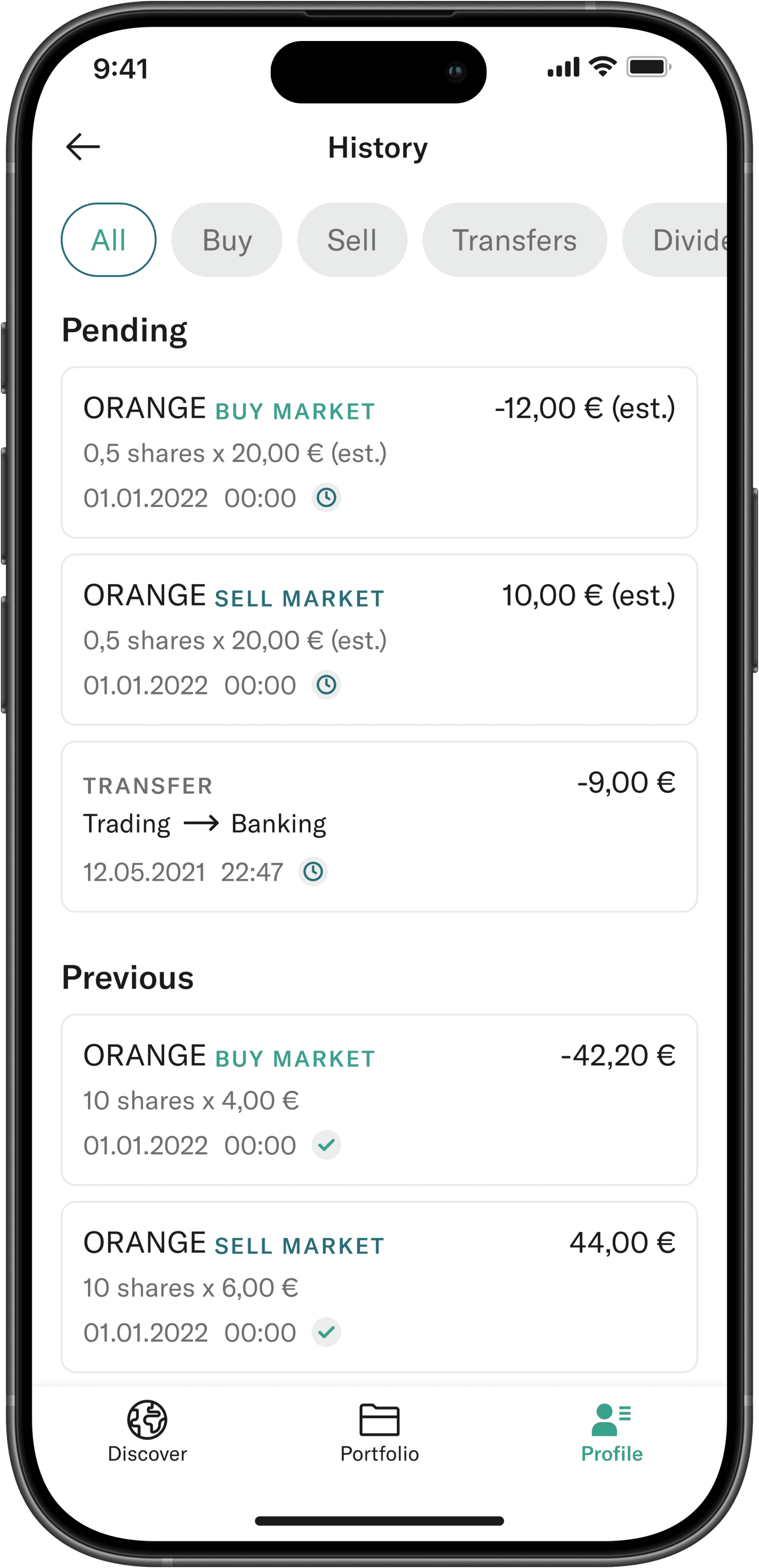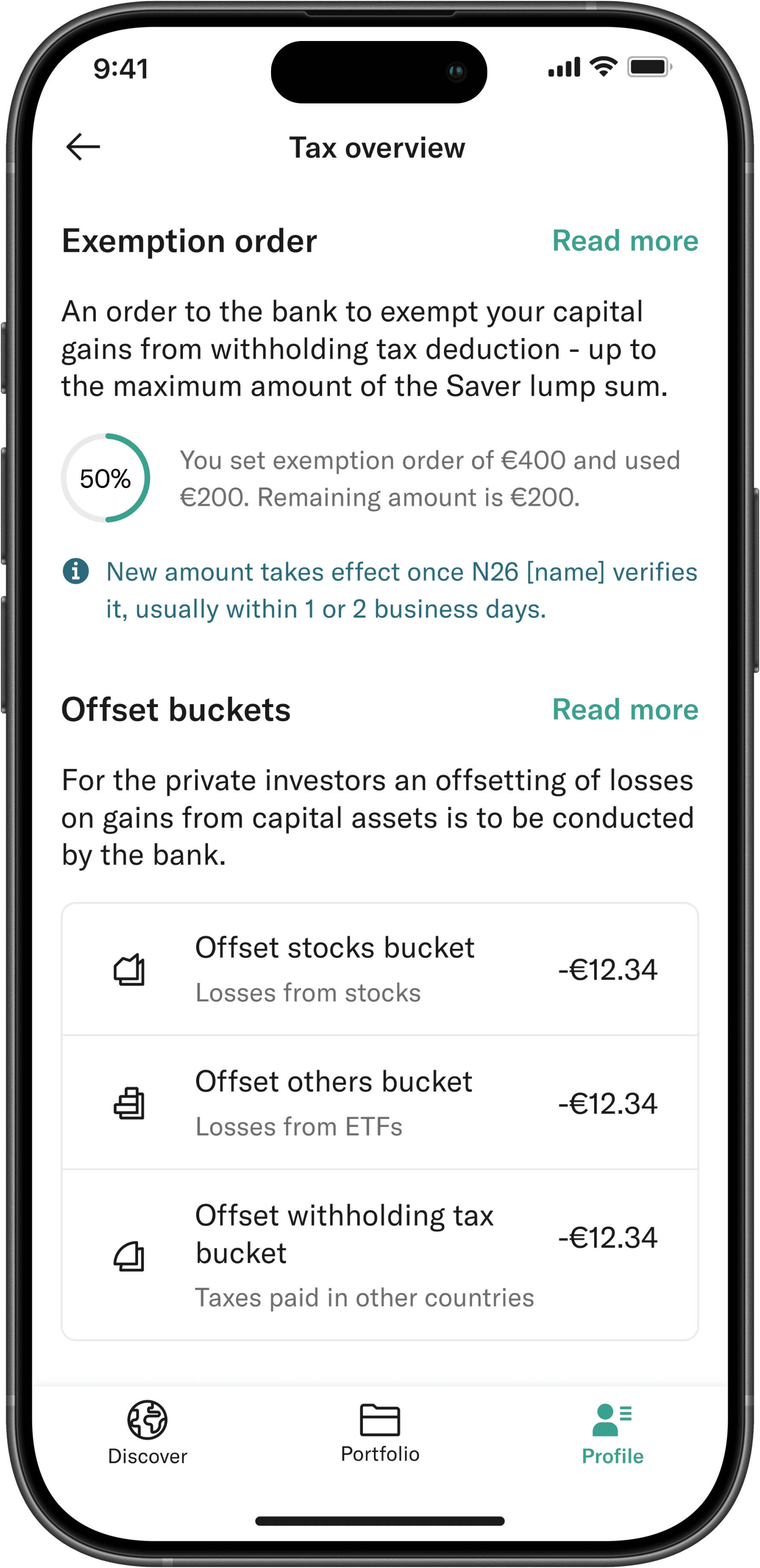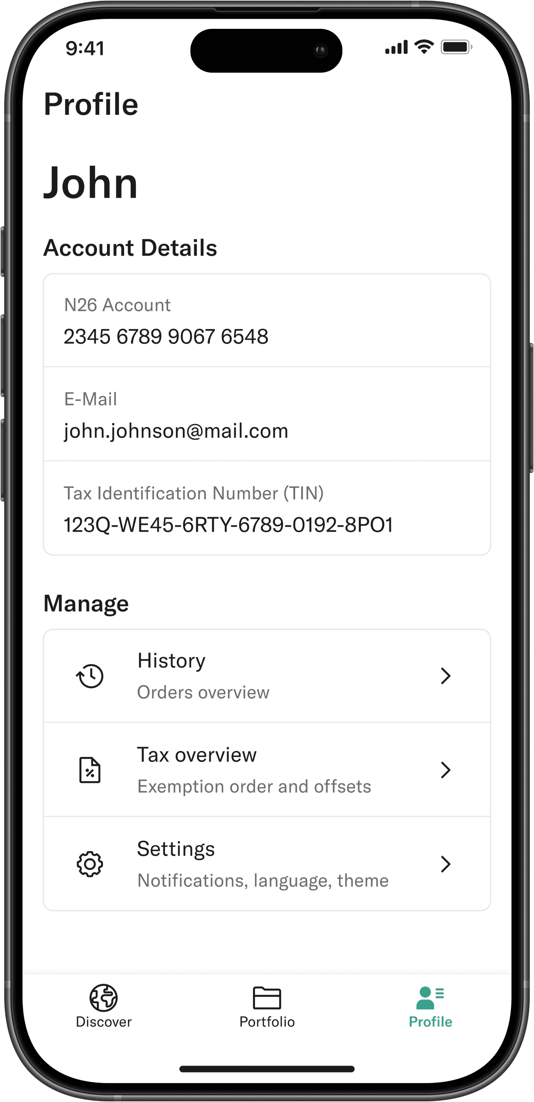 N26 Trading is a mobile stock and ETF trading product built directly into the N26 banking app. It allows users to invest in stocks and ETFs while managing their money in one place, combining trading, portfolio tracking, and legally required tax and reporting flows.